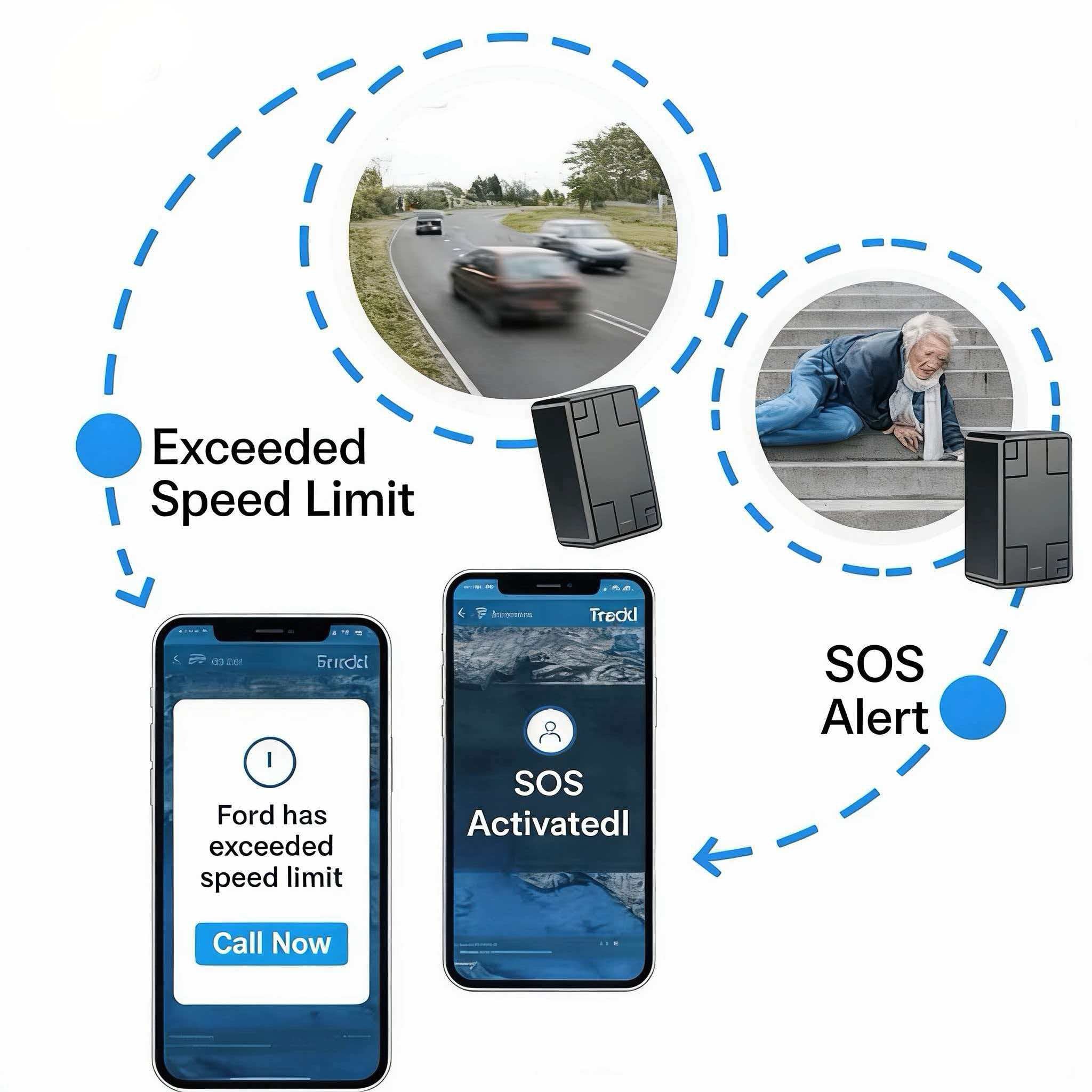 Get notified when your teen driver or employee is overspeeding or Get SOS alerts after the panic button is pressed by a falling grandma.